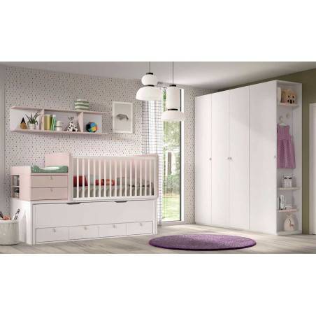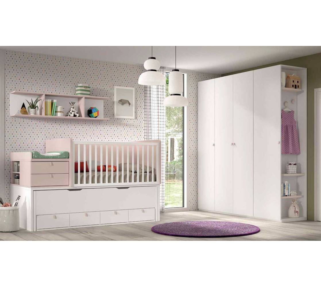 Cuna convertible 30 con nido oculto, barandilla recta con módulo 4 cajones bajos Ref D0050